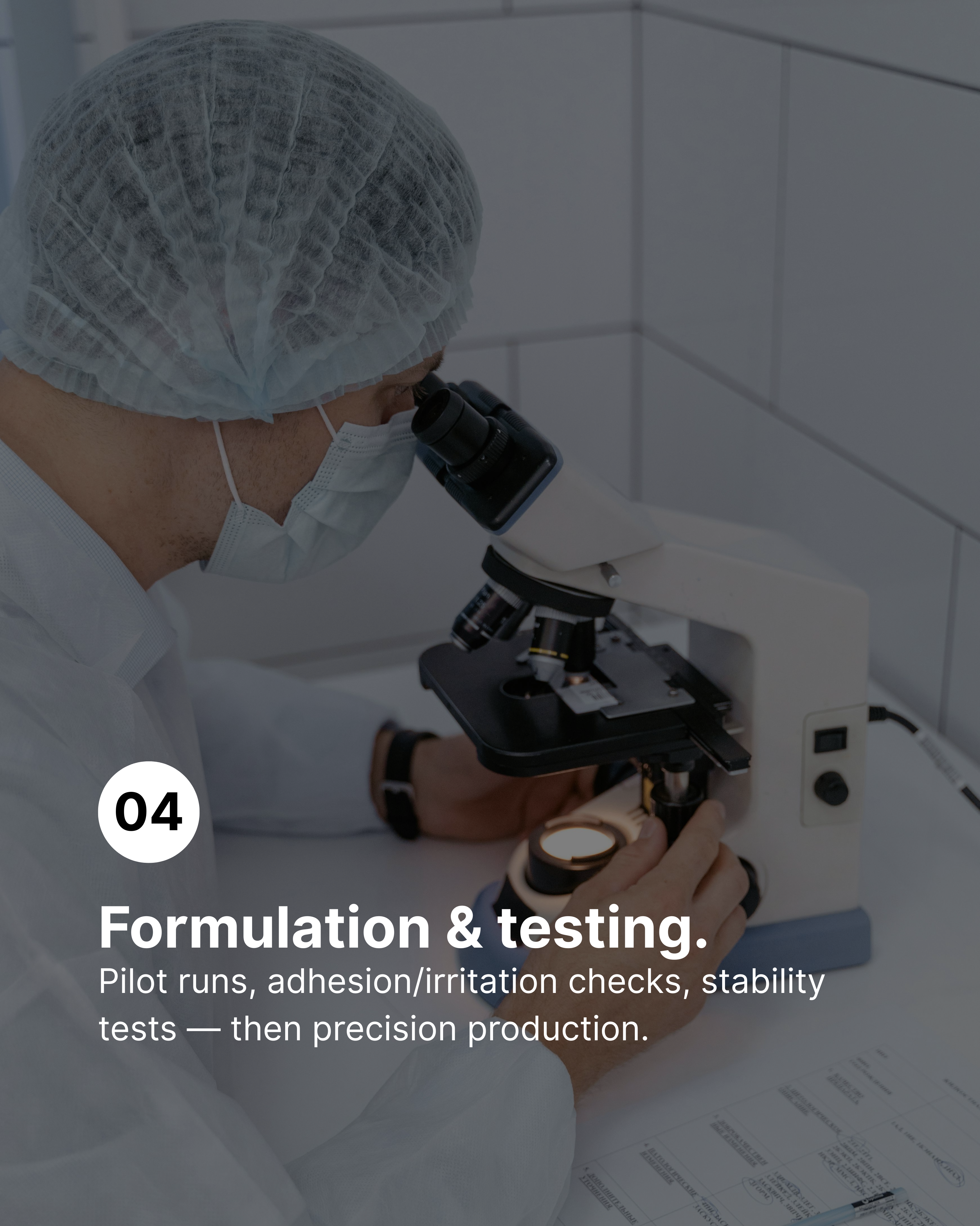 - Transdermal patch — breathable TPU film with latex-free adhesive sits on clean, dry skin (outer shoulder).
